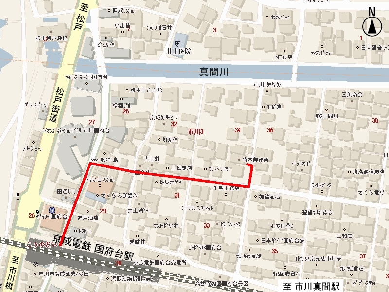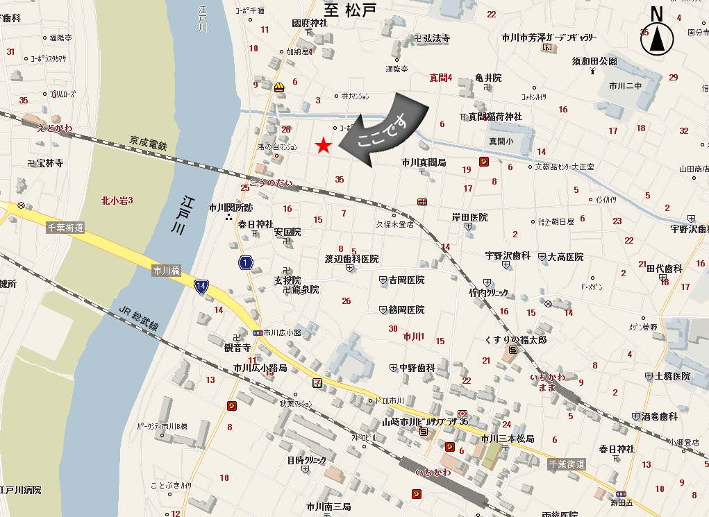 ●京成電鉄 国府台駅(こうのだい) 徒歩約5分京成電鉄 京成上野もしくは日暮里より 京成本線経由の 成田空港行き、うすい行き等 千葉方面行き 各駅停車にて約30分 京成船橋より上り 各駅停車にて約20分JR市川駅より 京成バス 松戸車庫行き(国府台駅経由)にて 国府台駅 停留所下車 徒歩約5分住所:千葉県 市川市 市川 3-34-19Tel: 047-322-9065